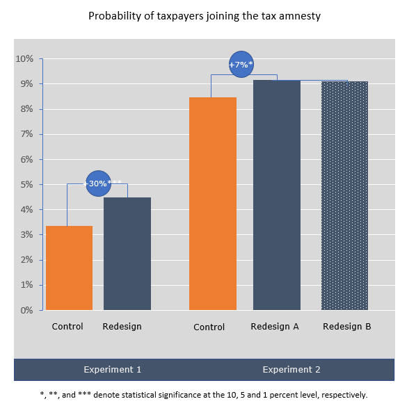 Overall results suggest that the way in which government communicates about the tax amnesty has a significant effect. The behaviorally informed notice was found to significantly encourage taxpayers to join the amnesty program. Among debtors reaching the 5-year debt limit (first experiment), the redesign encouraged a 30% higher participation rate than the original notice. Among debtors with more recent debts (second experiment), receiving either version of the redesign letter led to a 7% higher rate of participation in the program than the original letter.