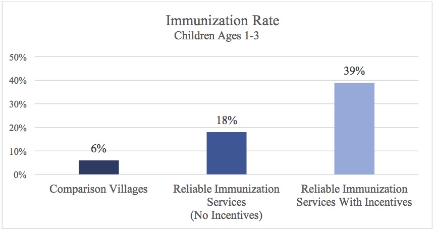 Providing reliable immunization services with the small incentives increased the number of children who were fully immunized by 33 percentage points.